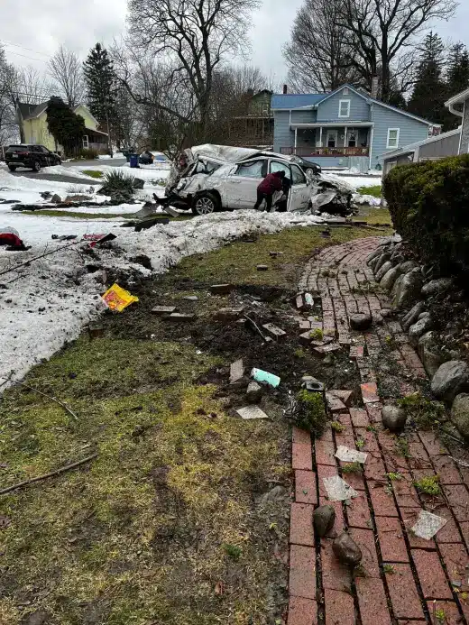 Investigators say the vehicle traveled at a high rate of speed on wet roads and failed to navigate a bend in Route 488 safely. The car then drove through two yards, struck a pool, and hit a porch, causing heavy damage to property and structures at the homes .