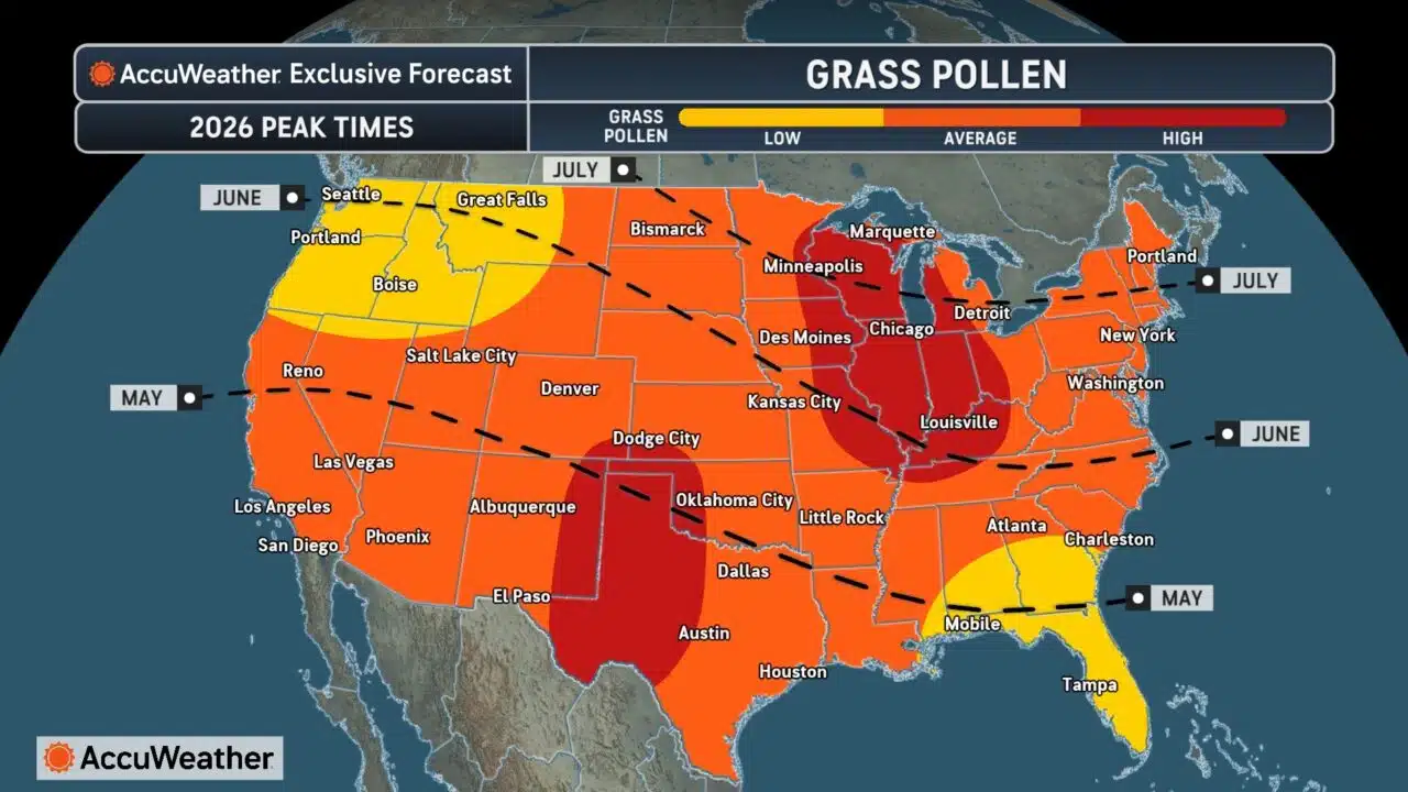 Meteorologists expect an early grass pollen spike across the northern Plains and Great Lakes during June and July.